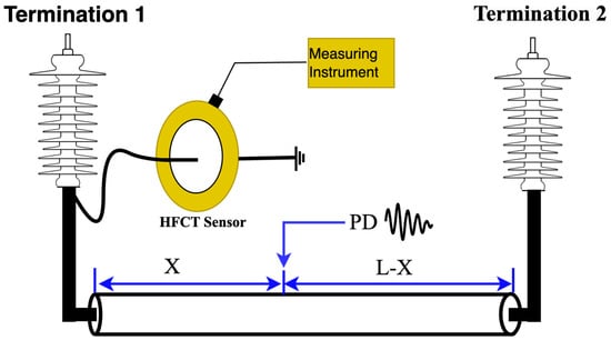 While amplitude is understandable immediately, PD pulses’ frequency content and temporal length must be measured. The set-up scheme is presented in Figure 7 [15,39]. The system consists of a cable and connects via two links (Termination 1 and Termination 2). PD is tested using a detector based on a high-frequency current converter (HFCT) installed at the grounding point of the first terminal (Termination 1), where the Variable Frequency Resonance Test System (VFRTS) is also connected to generate test signals. The cable is attached at one terminal to the VFRTS, while the other is open-circuited.