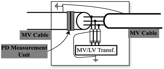 The system configuration is shown in Figure 8. In medium-voltage (MV) systems, PD measuring units are situated within a central ring main unit (RMU). An RMU is linked to one to five MV lines and an MV/low-voltage (LV) distributing transformer. The observation point (OP) within the RMU oversees one or many cable segments between two RMUs [41].
