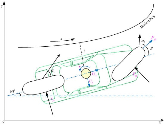 As shown in Figure 1, the desired path is used as a reference benchmark for the vehicle’s position. The distance traveled along this path is represented as , with the relative heading angle denoted as , and the lateral offset between the vehicle’s center of mass and the reference path is denoted as . Additionally, each point on the path has a continuously varying curvature , which can be calculated by integrating the heading angle and specific position of the reference path.