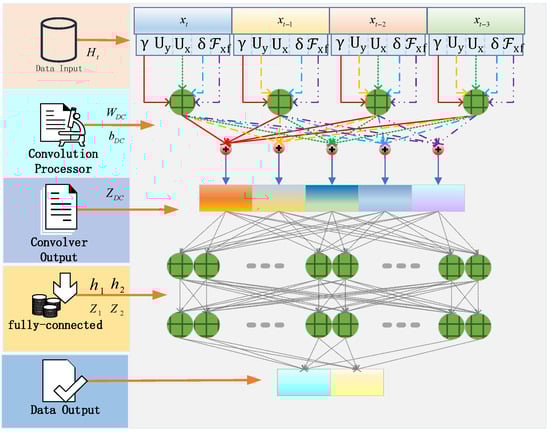 Unlike traditional physics-based bicycle models, the DCNN dynamic model can adaptively learn and capture the complex nonlinear dynamic effects caused by changes in the road–tire friction coefficient. Compared to fixed-parameter physics models, this method can more accurately describe the dynamic characteristics that are difficult to model directly while ensuring computational efficiency. As shown in Figure 2, the vehicle states and control information are used as inputs to the data input layer of the network. To capture the temporal dynamic characteristics of the vehicle system, the input not only includes the current state information but also incorporates historical state and control data from the previous time steps. Specifically, the input features consist of the current yaw rate , lateral velocity , longitudinal velocity , front wheel steering angle , and longitudinal force , along with the corresponding state and control information from the past three time steps. At each time step, the corresponding state variables are integrated into a unified state vector . These data are arranged in a sequential manner to form the input to the vehicle system . The structure of this input formulation is expressed in Equations (7) and (8):