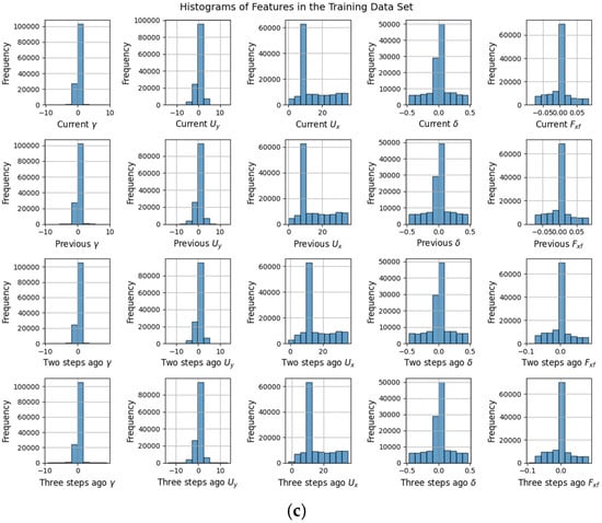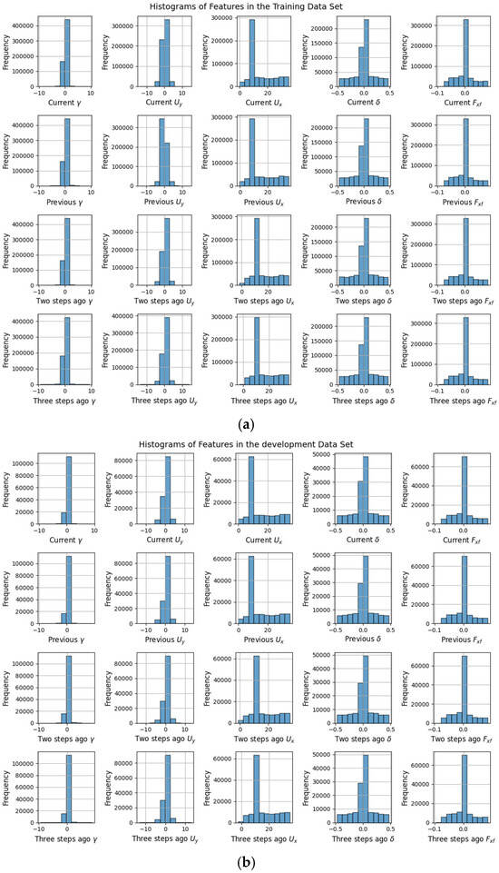 Before training, both the real-world data and the collected dataset were preprocessed. To enable the network to better learn the vehicle’s dynamic characteristics, five representative motion states of the vehicle, denoted as , were extracted from the full dataset and used as the network input. The dataset was then divided into training, validation, and test sets in a ratio of 70%, 15%, and 15%, respectively, ensuring consistent data distribution across the subsets. Each data sample consists of the vehicle’s state information at the current time step and the three preceding time steps. However, there is no temporal continuity between the adjacent samples, which ensures that the model learns generalizable motion patterns and improves its performance under varying driving conditions. To provide a clearer view of the dataset’s characteristics, Figure 3 presents feature histograms illustrating the distributions across the training, validation, and test sets.