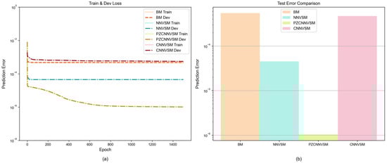 Figure 4a illustrates the variation trends of mean squared error (MSE) loss on the training and validation sets for BM, NNVSM, DCVSM, and CNNVSM over 1500 training epochs. As shown in the figure, BM, NNVSM, and CNNVSM stabilize at a very early stage. Although they converge quickly, their learning capacities are limited. In contrast, DCVSM continues to exhibit a significant decline in loss beyond 400 epochs, indicating higher learning efficiency and a sustained convergence process. CNNVSM performs relatively poorly during both training and validation, which can be attributed to the convolutional neural network’s need for pooling and padding operations. These steps increase the data volume and consequently reduce the learning efficiency while substantially increasing the computational cost. This observation further supports the effectiveness of the proposed method. Figure 4b presents a further quantitative comparison of the prediction errors on the test set for the four models. The corresponding MSE values for BM, NNVSM, DCVSM, and CNNVSM are 5.4672 × 10−4, 4.7194 × 10−4, 4.5278 × 10−5, and 1.0395 × 10−6, respectively. Comparing these results, it is evident that DCVSM achieves the best convergence in terms of prediction error and delivers the highest prediction accuracy, demonstrating its robust predictive capability under various driving conditions.