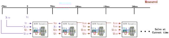 During the optimization process, the discretized neural network model is constructed as a function of historical state information and represented by DCNN. The simultaneous transcription method is used to unfold the DCNNVSM at each optimization stage within the prediction time domain, as shown in Figure 5. In the initial optimization phase, the neural network’s input contains only historical state information from real measurements, ensuring that the optimization problem is solved starting from the real physical state. In the subsequent optimization phases, the input data gradually shift from historical states to optimization variables (predictive states), allowing the DCNN to leverage its learned system dynamics.