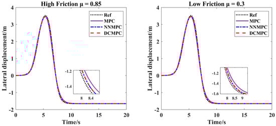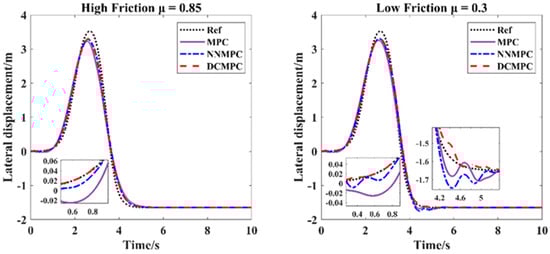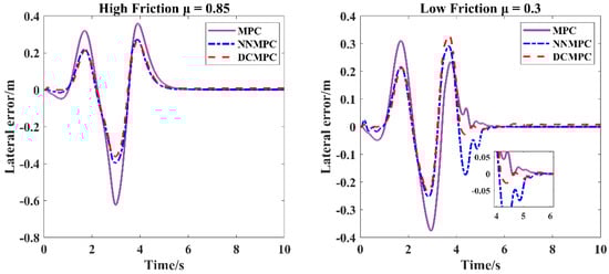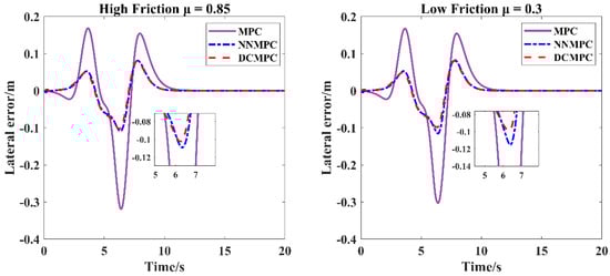 Figure 6, Figure 7, Figure 8 and Figure 9 illustrate the lateral displacement variations and lateral displacement errors under high- and low-friction conditions at vehicle velocities of 36 km/h and 72 km/h, respectively, for the three control algorithms. As observed from Figure 6 and Figure 8, the DCMPC demonstrates superior tracking performance during cornering, regardless of whether the vehicle is operating at low or medium-high velocity, or on high- or low-friction surfaces. According to the statistical data presented in Figure 7, at a vehicle speed of 36 km/h and under a road friction coefficient of μ = 0.85, the peak lateral errors for the DCMPC, NNMPC, and traditional MPC are 0.1024 m, 0.1090 m, and 0.3192 m, respectively, with corresponding RMSE values of 0.0335 m, 0.0342 m, and 0.0836 m, respectively. Under a lower friction coefficient of μ = 0.3, the peak lateral errors are 0.0987 m for the DCMPC, 0.1155 m for the NNMPC, and 0.3027 m for the traditional MPC, with RMSE values of 0.0330 m, 0.0349 m, and 0.0810 m, respectively. Both the DCMPC and NNMPC demonstrate better overall control performance, while the traditional MPC shows inferior results. According to the statistical data in Figure 9, at a higher vehicle speed of 72 km/h and with a friction coefficient of μ = 0.85, the peak lateral errors for the DCMPC, NNMPC, and traditional MPC increase to 0.3610 m, 0.3954 m, and 0.5945 m, with corresponding RMSE values of 0.1199 m, 0.1287 m, and 0.1831 m. Under the low-friction condition of μ = 0.3, the peak lateral errors are 0.3307 m, 0.2921 m, and 0.3757 m, and the RMSE values are 0.1028 m, 0.1040 m, and 0.1245 m for the DCMPC, NNMPC, and traditional MPC, respectively. At higher speeds, the traditional MPC clearly underperforms as compared with the other two methods. Although all three algorithms exhibit increased peak errors and RMSE values under high-speed conditions, the DCMPC consistently achieves the smallest lateral errors and the lowest fluctuation amplitude. These results further demonstrate the adaptability and effectiveness of the DCMPC under various operating conditions.