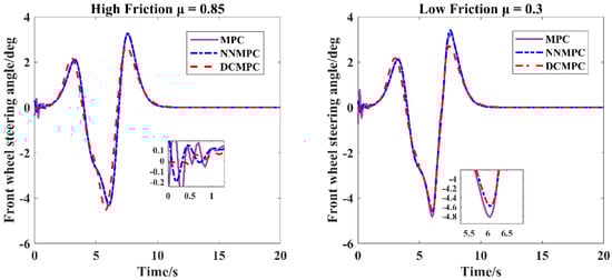 Variation in front wheel steering angle at 72 km/h under varying friction coefficients.