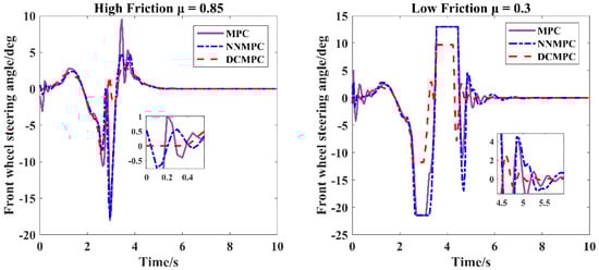 Figure 10 and Figure 11 illustrate the front wheel steering angle (FWSA) inputs under different vehicle velocities and road friction coefficients for the three controllers. It can be observed that DCMPC outperforms both the traditional MPC and NNMPC in terms of FWSA control across all tested conditions. As the vehicle velocity increases, both the traditional MPC and NNMPC exhibit varying degrees of oscillation in FWSA, whereas the DCMPC consistently maintains stability during the initial phase. Under the low-friction condition at 36 km/h and the high-friction condition at 72 km/h, the DCMPC keeps the FWSA within 5°. Although the FWSA peak value under the 72 km/h low-friction condition reaches −11.75°, it still meets the physical requirements for intelligent vehicles. In contrast, the peak values for the traditional MPC and NNMPC reach 21.45° and 21.41°, respectively, exceeding the vehicle’s physical limits. This demonstrates that the DCMPC offers superior control performance and generates FWSA values more in line with the physical demands of intelligent vehicles.