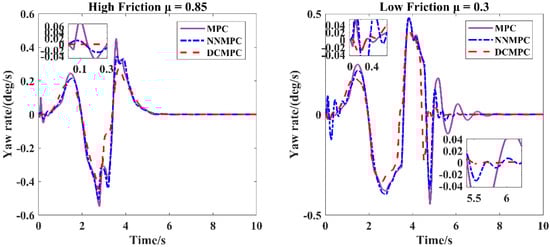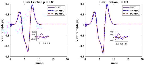 Figure 12 and Figure 13 also present a comparison of lateral yaw rates under different vehicle velocities and friction coefficients. The results show that the DCMPC maintains excellent stability during the initial stage under both 36 km/h and 72 km/h driving conditions. It can be observed that the amplitude of the lateral yaw rate increases with vehicle speed for all three controllers. Additionally, the DCMPC consistently achieves a lower yaw rate amplitude than the other two controllers across all conditions. Notably, under the high-speed, low-friction condition (72 km/h), the DCMPC does not exhibit significant oscillations, indicating that the proposed control method maintains robust stability even in challenging dynamic environments.