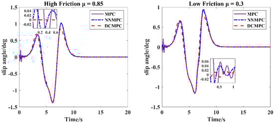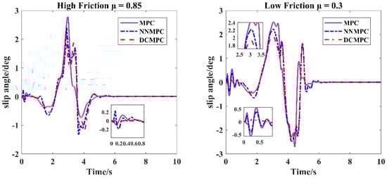 Comparison of variation sideslip angles at the center of mass at 72 km/h under varying friction coefficients.