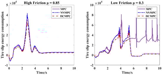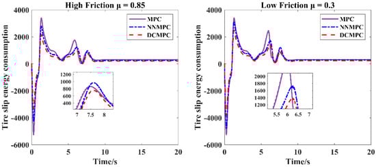 As shown by the comparisons of Figure 16 and Figure 17 with Figure 7 and Figure 9, higher tire-slip energy losses are observed during the periods of 0–3 s and 4–6 s, which correspond to the intervals in which the vehicle exhibits larger tracking errors. This phenomenon is primarily due to steering maneuvers taking place during these periods, which have a notable impact on tire slip-related energy consumption. After 6 s, the tracking error gradually decreases and stabilizes, and correspondingly, the tire slip energy loss also diminishes and stabilizes. This observation indicates a clear correlation: tire-slip energy consumption increases with larger tracking errors and decreases as tracking accuracy improves.