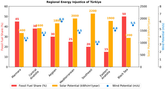 Regional energy inequality shows the differences in the use of energy resources and the unequal distribution of energy potential among various provinces of Türkiye. Figure 3 visualizes the regional differences between solar and fossil fuel consumption. Türkiye’s fossil fuel dependency on electricity generation leads to price fluctuations of imported resources [33] and supply security risks [34]. On the other hand, the domestic potential in renewable energy (e.g., up to 2200 kWh/m2-year in solar energy) offers a strategic opportunity for energy independence (see Figure 3).