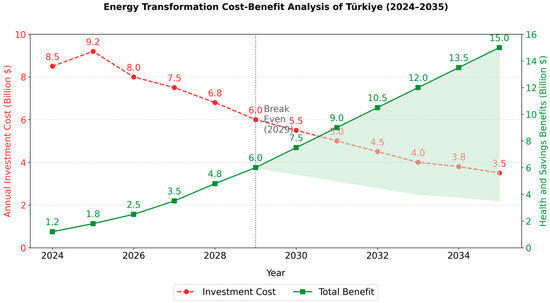 The cost–benefit analysis conducted in this study compares the initial investment costs of Türkiye’s energy transition strategies for 2024–2035 with the long-term social and economic returns. As seen in Figure 4, high capital investments are required for renewable energy infrastructures and energy efficiency projects in the first years. However, energy efficiency savings and health cost reductions due to air pollution show their effects over time. After 2031, the total benefits exceed the total investment costs. This analysis reveals that although the energy transition creates a financial burden initially, it provides a net economic and social gain in the medium and long term.