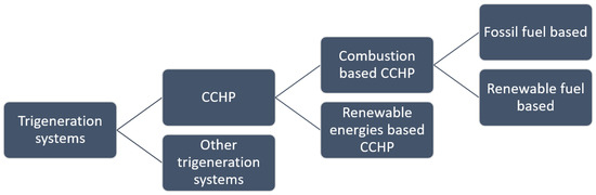As seen in Figure 4, trigeneration systems are not necessarily CCHPs. Other useful outputs can be considered than cooling, heating, and power generation. In this review, trigeneration systems that are not CCHPs will be considered as other multi-generation systems. The heat energy can come from either combustion or renewable sources, such as solar or geothermal sources [16,17,18]. As for the combustion process, this can be done with biogas or other types of renewable fuels.