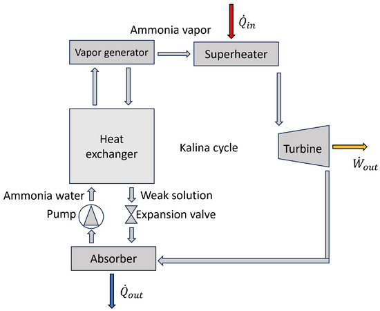 A Kalina cycle is similarly used to produce mechanical energy using a low-temperature heat source. Improving the exergy efficiency of a steam Rankine cycle pushed Kalina et al. to develop this thermodynamic cycle [81]. Compared to Rankine cycles, which use either water or an organic working fluid, a Kalina cycle uses a mixture of ammonia () and water. This cycle has been considered both for cogeneration and for trigeneration [82]. Different Kalina cycle configurations have been investigated depending on the specific application [83,84,85,86]. In the heat recovery unit, the mixture of water and ammonia is separated. Because of the lower boiling point of ammonia, ammonia vapor is formed and is superheated before entering the turbine, where its expansion converts the thermal energy into mechanical energy. A generator then converts it into electricity. After leaving the turbine, the low-temperature vapor is mixed with the weak solution: the mixture of water and ammonia that has not evaporated. The mixture regains its initial concentration and is pumped back to the heat recovery where the cycle begins anew [81,87]. It is investigated in CCHP systems in [88,89,90].