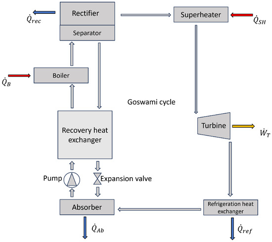 A Goswami cycle is a modified Kalina cycle, as it combines the working principle of the latter, coupling it with an absorption refrigeration process [91]. In a similar manner to a KC, the ammonia and water mix is preheated by the weak solution going to the absorber. After being preheated, the mix is partially boiled to produce a two-phase mixture. The vapor with high ammonia concentration enters the rectifier after the remaining liquid is removed in the separator. The rectifier condenses out any remaining water, and almost pure ammonia vapor is superheated before entering the turbine. The expansion process produces mechanical energy. The vapor exiting the turbine then enters the refrigeration heat exchanger, where sensible heat exchange provides the cooling generation. The cold ammonia mixture lastly enters the absorber, where it is absorbed by the weak solution. The mixture regains its initial concentration and is pumped back to the heat recovery exchanger. Extensive research has been conducted in order to enhance this cycle’s operation. Because of the desired low vapor temperature required for cooling generation, which is detrimental to power production, a study shows that a heat source of 87 °C allows for optimum production of the two useful effects. It is reported that heat sources hotter than 167 °C would result in an absence of cooling generation [92]. This is present in the following studies [93,94,95].
