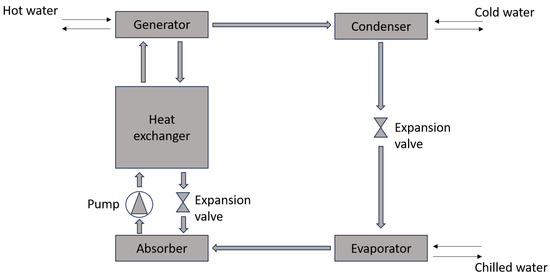 Cooling is usually provided by vapor compression systems. Such systems require high amounts of electricity to work and do not utilize renewable heat or waste-heat energy. Although being the most widely used refrigeration system worldwide, it is necessary to increase their efficiency or to use other, more performant, quieter cooling systems [112,113,114,115]. The use of thermally activated cooling rather than conventional compression units is what allows CCHP systems to have overall good energy and exergy efficiency, as heat exiting the prime mover can be used rather than released to the atmosphere. Absorption chillers (Figure 8) are heat-driven cooling systems. Such systems are able to use waste-heat from industrial sites as well as renewable heat sources and are considered better alternatives than vapor compression systems when heat is readily available [116]. Therefore, they are the most widely used cooling unit found in CCHP systems, regardless of prime mover used. The main difference between the working principles of VCS and ACs is that the vapor compressor is replaced by an absorber, a pump, and a generator. The use of a pump rather than a compressor allows for high electricity savings. The working fluids also are different, with ACs commonly using water/NH3 and LiBr/water as absorbent/refrigerant couples. Other working mixtures exist [117], and a review on the influence of nanoparticles on AC performance can be found in [118]. Absorption chillers are tri-thermal thermodynamic cycles; a “high” heat source (around 85 °C) allows the working fluid to evaporate, cooling is produced (around 5 °C), and heat (around 35 °C) is rejected. The more detailed working principle, similar to the KC (Kalina Cycle) or GC (Goswami Cycle), is as follows: the strong absorbent/refrigerant mixture is pumped to the generator and preheated in the solution heat exchanger by the weak solution. The weak solution is the low-refrigerant mixture that flows from the generator back to the absorber.The mixture heated in the generator releases refrigerant vapor, which is then cooled in the condenser. Heat is released to the environment or to an external fluid, and the refrigerant vapor is converted into a liquid state. The saturated refrigerant liquid expands through a valve, decreasing its pressure to the evaporator pressure, then it enters the evaporator. Heat is absorbed from the external fluid, turning the refrigerant back into vapor and producing the cooling effect. The refrigerant vapor leaving the evaporator enters the absorber, where it is mixed with the weak solution coming from the generator. The strong absorbent/refrigerant solution is regenerated and is pumped to the solution heat exchanger, closing the cycle [119]. As mentioned earlier, it is extensively used in CCHP systems [72,96,120,121].
