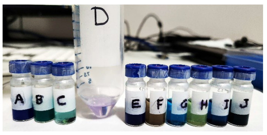 The aliquots were prepared following the procedures by Yamada et al. [25]. The individual aliquots were prepared as per Table 4. They were prepared in glass vials and sonicated for 15 min to accelerate the dissolving action. Aliquot D used 70% isopropanol, as there was an oil and water-like separation in THF. After 24 h, aliquots A, B, E, F, G, H, and J had some undissolved powders at the bottom, while C and I had polymer-like substances floating at the bottom. Aliquot D formed a fully soluble solution. Literature notes that NafionTM can form complexes with the metal ions [26]. Figure 1 shows the solutions after 200 s of sonication. THF can also polymerize in the presence of strong acids, which can be found in the NafionTM polymer [27]. These observations in the solutions could be attributed to the potential interaction between the NafionTM polymer with the chelated metal complex molecules and/or THF solvent.