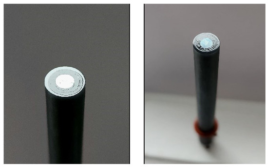 The procedure to prepare the electrode for each solution of aliquots A-2 through J-2 was adopted in part from Yamada et al., where a Fe complex was dissolved in benzonitrile with a trace amount of TFA and applied to a GC carbon electrode. The electrode was dried in a 70 °C oven for 40 min and then coated in a Nafion solution and then dried in an oven again [25]. For this experiment, before the complexes were applied to the GC electrodes, the GC electrodes were polished. Before every use, the electrode was polished using 5000, 14,000, and 50,000 grit polishing pastes on a thin microfiber cloth using a figure-8 motion to ensure even polishing. After the polishing, the electrodes were rinsed using 70% isopropanol and sonicated in 70% isopropanol for 200 s. After being sonicated, the electrodes were rinsed with reverse-osmosis water and left to dry at room temperature. A total of 7 µL of each chelated metal complex aliquot was pipetted onto the surface of the clean GC electrode in three stages. A total of 7 µL was experimentally optimized through testing for optimal and even electrode coverage. First, 3 µL was dispensed and then left to dry in a 75 °C oven. Then, 2 µL was dispensed and dried at the same temperature and time. The remaining aliquot was then added and dried in the same way. Once the entire 7 µL was applied and dried, the electrode tip was covered with 10 µL of 5% Nafion™ polymer solution in methanol and was allowed to dry fully by placing it in the 75°C oven for 15 min. The purpose of the final heating process is to ensure the electrode is fully set and does not impact the Nafion structure. The fully decorated electrodes were cooled off to room temperature before use in the experiments. Figure 2 shows what the decorated electrode looks like after the procedure is completed.