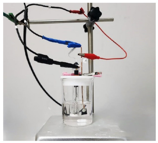 The performance of the electrodes was evaluated using a single-compartment fuel cell (Figure 3). This fuel cell setup consisted of the cell chamber (a 100 mL glass beaker), filled with 50 mL of an acidic hydrogen peroxide electrolyte (containing 0.5 M hydrogen peroxide, 1 M sodium chloride, and 0.1 M hydrochloric acid in reverse-osmosis water). The electrolyte and pH were kept consistent for all experiments. A Teflon cap with pre-drilled holes for electrode placement was used to cover the beaker and placed over a magnetic mixer. The cell output potential was measured by pairing the electrode combinations after 3 min of the electrodes being submerged. The voltammograms were generated using the potentiostat, with each chelated metal complex electrode as the working electrode, the coiled wire platinum electrode as the counter electrode, and the Ag/AgCl filled with 3M NaCl as the reference electrode.