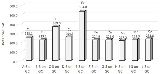 The open-circuit potentials with the Ag/AgCl reference electrode for A-3 through J-3 decorated electrodes are summarized in Figure 5. An adjustment of +209 mV was made to account for the reference electrode’s reduction potential, which is a standard value. The cyclic voltammograms for all high-performing electrodes in the acidic electrolyte are overlapped in Figure 6. The individual cyclic voltammograms of each electrode material can be found in Figure A1, Figure A2, Figure A3, Figure A4, Figure A5, Figure A6, Figure A7, Figure A8, Figure A9 and Figure A10 in Appendix A. The cyclic voltammograms for each material are asymmetrical. This is expected as the reaction is irreversible; a symmetrical voltammogram would be a rare occurrence due to the differences in the cathodic and anodic chemical reaction [31]. Further investigations would be required to determine the specific source of the asymmetry. Each chelated metal complex electrode’s relative peak power density was extrapolated using its respective voltammogram’s highest current densities and potential values, normalized using the GC surface, as it has an even layer of the chelated metal. The calculated values are in Table 7.