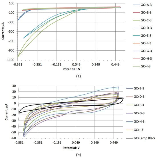 Overlapped cyclic voltammograms of the electrodes tested. A-3, C-3, E-3 were removed in (b) to improve the visibility of the remaining results. (a) The cyclic voltammograms of A-3 through K-3 electrodes in the acidic electrolyte. (b) The cyclic voltammograms without A-3, C-3, E-3.