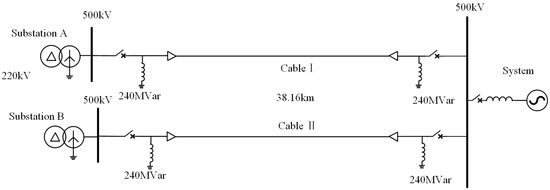 The 500 kV transmission and transformation project in Beijing is a pure cable line project, in which the 500 kV power system is connected to substations A and B through 38.6 km long cables. Each cable line is equipped with a 240 MVar high-voltage shunt reactor at both ends. The low-voltage sides of both substations are connected to the 500 kV grid. The equivalent diagram of this transmission project is shown in