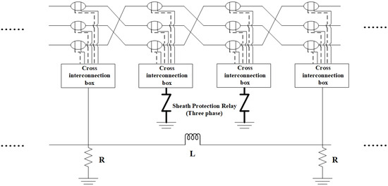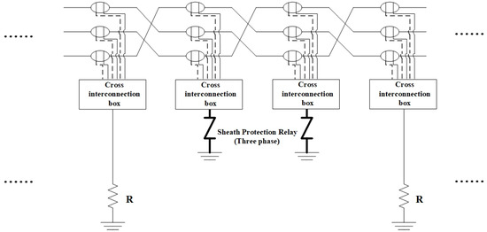 2, and the total length of a single cable is 38.16 km. The cable is grounded by cross interconnection. The cable undergoes a cross-bonding transposition every 530 m, and the cross-interconnection sections are set to 1590 m. There are 24 cross interconnection sections in the whole line. The grounding resistance connection method is shown in