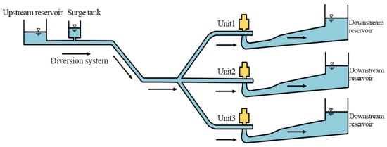 A hydropower station’s diversion system consists of upstream and downstream reservoirs, diversion tunnels, a surge tank, and pressure pipes. The water hammer equation for a pressure pipe is a quasi-linear partial differential equation system involving flow velocity V and water head H. This paper solves the water hammer equation using MOC, and the schematic diagram of the hydropower generation system is shown in Figure 1.