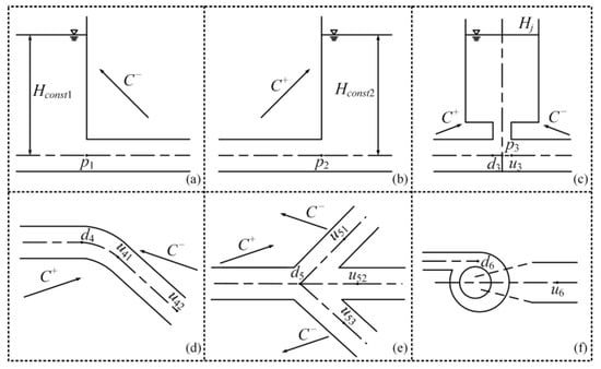 The primary function of the surge tank is to reduce water hammer pressure in the pipeline. It can be classified into various types, including impedance surge tanks, air cushion surge tanks, differential surge tanks, variable cross-section surge tanks, and others. In this paper, the widely used impedance surge tank is selected, as shown in Figure 3c, and the C+ and C− equations can be derived for the d3 and u3 sections, respectively.