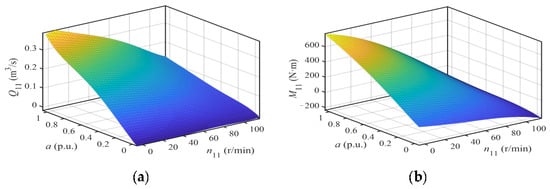 where Q11 is the unit flow rate, M11 is the unit torque, n11 is the unit rotational speed, and a is the guide vane opening.