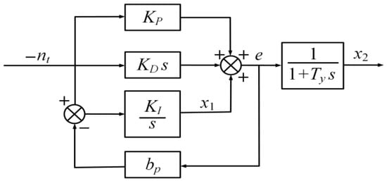 where KP, KI, and KD is the proportional, integral, and differential coefficients of the PID speed controller, respectively; x1 and e are intermediate variables, and x2 is the output variable; nt is the unit rotational speed, Ty is the governor response time, and bp is the steady-state slip coefficient.