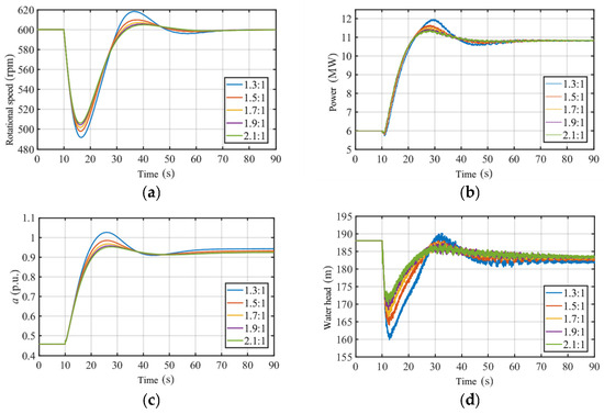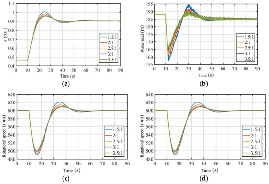 Dynamic response of the unit under different pipe diameter ratios. (a) Guide vane opening; (b) unit water head; (c) unit rotational speed; (d) unit power.