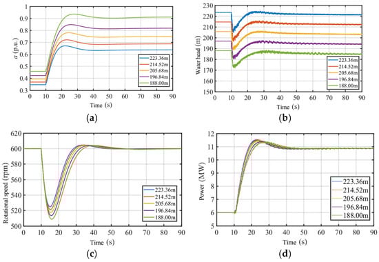 Dynamic response of the unit under different water heads. (a) Guide vane opening; (b) unit water head; (c) unit rotational speed; (d) unit power.
