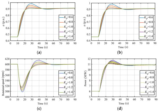 Dynamic response of the unit under different proportional gains. (a) Guide vane opening; (b) unit water head; (c) unit rotational speed; (d) unit power.