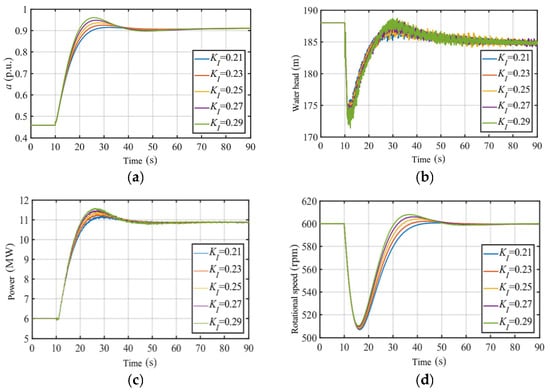 Dynamic response of the unit under different integral gains. (a) Guide vane opening; (b) unit water head; (c) unit rotational speed; (d) unit power.
