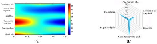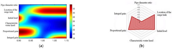 The sensitivity of the unit’s regulation performance indicators to various structural-operational-control characteristics varies significantly, as shown in Figure 12, Figure 13, Figure 14, Figure 15, Figure 16 and Figure 17. Among them, the proportional gain is the most sensitive to the rotational speed regulation time, while the pipe diameter ratio is the least sensitive. The sensitivity ranking of each structural-operational-control parameter to the radar chart’s rotational speed regulation time is as follows: proportional gain > surge tank location > initial load > integral gain > characteristic water head > pipe diameter ratio. In terms of rotational speed overshoot, the initial load has the highest sensitivity, while the other parameters have relatively low sensitivity, with the following ranking: initial load > surge tank location > pipe diameter ratio > integral gain > characteristic water head > proportional gain. The integral gain has the greatest impact on the rotational speed rise time, followed by the characteristic water head, in this order: integral gain > characteristic water head > surge tank location > proportional gain > pipe diameter ratio > initial load. The characteristic water head has the greatest influence on rotational speed peak time, followed by integral gain, surge tank location, proportional gain, pipe diameter ratio, and initial load. The initial load is the most sensitive to the inversion power peak, with the following sensitivity ranking: initial load > surge tank location > integral gain > characteristic water head > proportional gain > pipe diameter ratio. The characteristic water head is the most sensitive to the inversion power peak time, with the following order: characteristic water head > pipe diameter ratio > initial load > integral gain > surge tank location > proportional gain.