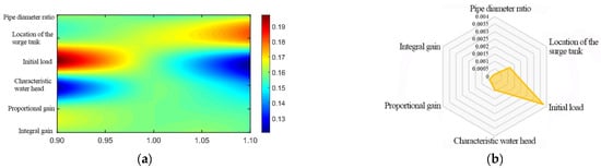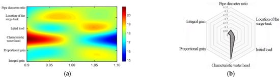The previous section examined the impact of structural design parameters, operating conditions, and system control parameters on the unit’s operating characteristics during load increases. Based on the results, the initial input parameters were selected within a ±10% range of values. The effect of each 1% variation in input parameters on operating characteristics was measured. The sensitivity of each parameter to various performance indicators was examined, and the influence of different structural-operating-control input parameters on the unit system’s operating characteristics was compared. This analysis serves as a reference for structural design and the safe and stable operation of hydropower systems. Figure 12, Figure 13, Figure 14, Figure 15, Figure 16 and Figure 17 depict sensitivity heat maps and radar charts for the rotational speed regulation time, rotational speed overshoot, rotational speed rise time, rotational speed peak time, inversion power peak, and inversion power peak time for various structural operating control input parameters.