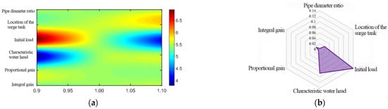 Sensitivity of different input parameters to the rotational speed regulation time. (a) Sensitivity heat map; (b) radar map.