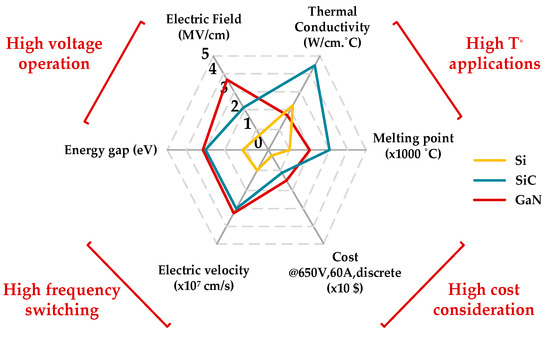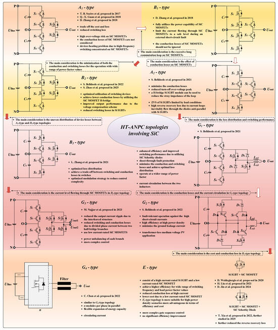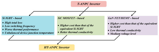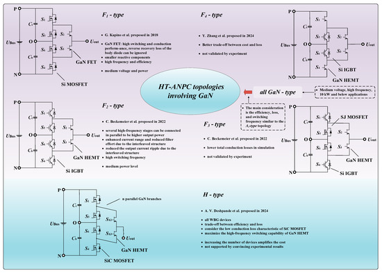 - In high-frequency and high-power applications, topologies involving SiC devices should be given priority. Topologies involving GaN devices should be given priority in high-frequency and medium–low-voltage applications. If the application has high requirements for power density, the B-type HT-ANPC topologies should be given priority.