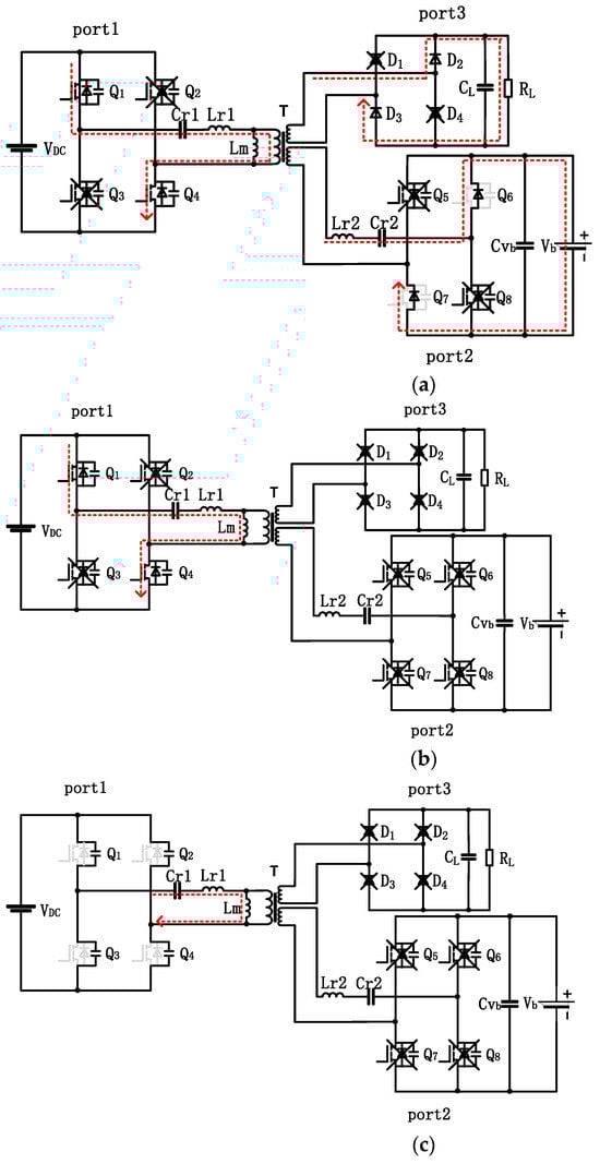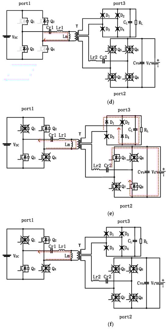 Mode 1: As shown in Figure 5a, when Q1 and Q4 are on, the converter operates in mode 1. Lr1, Cr1, and Cr2 participate in the resonance together, and the energy is transferred from port 1 to ports 2 and 3. In this mode, the photovoltaic field continuously supplies energy to the load, and the remaining energy is stored in the energy storage element.