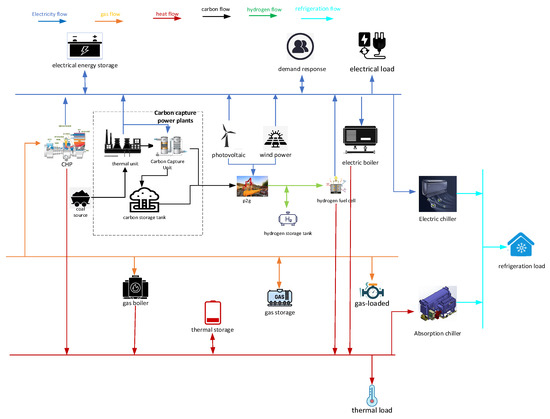 The VPP model proposed in this paper is shown in Figure 1. It includes a carbon capture power plant, combined heat and power (CHP) unit, gas boiler, wind turbine, photovoltaic power plant, hydrogen fuel cell (HFC), electric boiler, electric refrigeration unit, absorption chiller, power-to-gas device (P2G), as well as thermal energy storage, electric energy storage, and gas energy storage systems. The electric load is mainly supplied by the CHP unit, carbon capture power plant, wind turbine, photovoltaic power plant, hydrogen fuel cell, and the charging and discharging of electric energy storage. The heat load is mainly met by the CHP unit, gas boiler, electric boiler, hydrogen fuel cell, and the charging and discharging of thermal energy storage. The gas load is mainly supplied by the gas purchased from the upper-level gas network.
