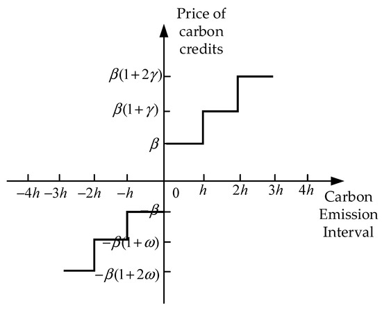 The carbon trading mechanism refers to a system where, in order to reduce carbon emissions, the government department assigns carbon emission targets to enterprises based on the previous year’s power generation. Thus, enterprises with lower carbon emissions can sell their excess carbon emissions in the carbon trading market to generate revenue, while enterprises with higher carbon emissions need to purchase carbon allowances from the carbon trading market. The traditional carbon trading price is relatively fixed, and it is not very effective in motivating enterprise users to reduce carbon emissions. Therefore, this paper introduces the ladder-carbon-trading mechanism to encourage enterprises to reduce carbon emissions. The ladder-carbon-trading model mainly includes the carbon emission quota model, the actual carbon emission model, and the ladder-carbon-emission-trading model [18,19].