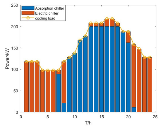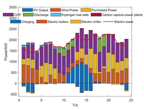 In order to achieve the lowest daily dispatch cost for the VPP system, the output profile of each unit varies with the time-of-day electricity and gas prices. In the VPP system, the electrical loads are mainly supplied by the external grid and internal CHP units, wind turbines, photovoltaic plants, HFCs, and storage units; the thermal loads are mainly met by the gas boilers, electric boilers, and heat storage units; the cooling loads are supplied by electric and absorption chillers; and the gas loads are mainly met by natural gas purchased from the external grid and supplemented by electricity-to-gas units.