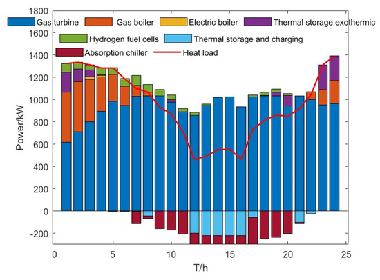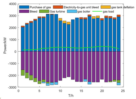 In the trough period from 23:00 to 04:00 the next day, the demand for electricity load is low. During this period, electricity and gas prices are low, and wind turbine output is high. To leverage the benefit of purchasing electricity from the grid, excess electricity is used to charge the electric energy storage device. At the same time, since the demand for heat energy is higher in this period, the heat supply is mainly achieved through the regulation of electric boilers, gas boilers, and cogeneration units, as well as the exothermic regulation of heat storage. Natural gas purchased from the external gas network during this period is mainly supplied to the CHP and gas boilers, and demand is met by regulating the gas output from the electricity-to-gas converter.