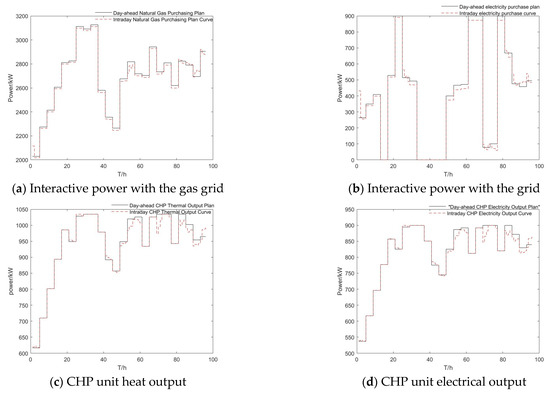 Figure 11 shows the results of day-ahead optimal scheduling and intraday rolling optimization for the VPP system units. A comparative analysis of the exchanged power with the grid shows that the VPP’s intraday power procurement plan strictly adheres to the day-ahead procurement plan, resulting in minimal differences in interaction costs between the two time periods, thus reducing the daily operating costs of the VPP system. Similarly, the results of the interaction with the natural gas grid show that the day-ahead natural gas procurement plan is highly aligned with the day-ahead power procurement plan, supporting the VPP’s natural gas, power, and heat requirements. The power and heat output schedules of the combined heat and power (CHP) units show a close correspondence between day-ahead and intraday schedules, thus meeting the VPP’s power and heat needs.