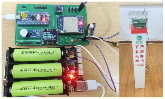 Figure 8 illustrates the implemented system configuration, with the core sensing device positioned on the left and the cable external breakage source localization system on the right. The primary experimental apparatus comprises the STM32F103C8T6 microcontroller (ST Microelectronics, Geneva, Switzerland), the MAX9814 acquisition module (Maxim Integrated Products, CA, USA), and the FT232RL serial communication module (Future Technology Devices International, Glasgow, UK), which transmits the captured acoustic data to the computer via the USART serial port.