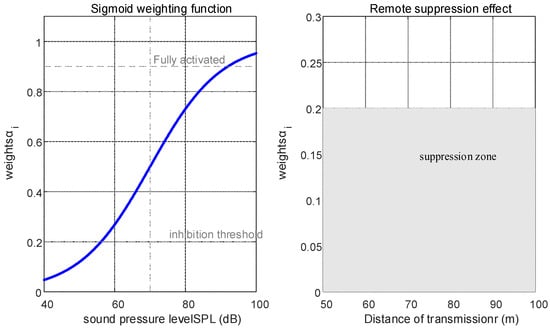 θ = 70 dB. Specifically, the weights converge rapidly to values above 0.9 when the sound pressure level (SPL) exceeds 80 dB, while they decline to below 0.1 when the SPL is less than 50 dB. Moreover, as the distance from the sound source exceeds 50 m—corresponding to an SPL below 50 dB—the weights stabilize at values below 0.2. These findings confirm the efficacy of Equation (17) in evaluating transducer reliability.