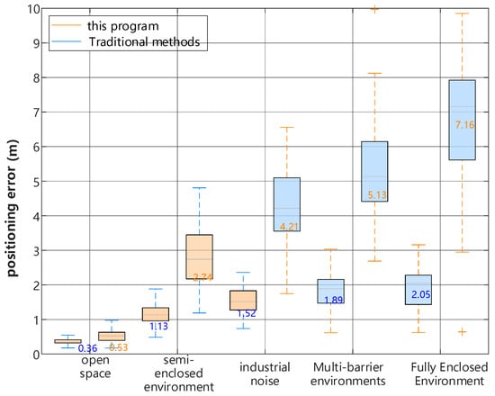 Figure 12 illustrates that the localization error of the proposed algorithm is reduced relative to that of traditional methods. In a multi-obstacle environment, the error decreases from 5.13 m to 1.89 m—a reduction of 63.2%—demonstrating that the adaptive environment compensation algorithm effectively suppresses multipath interference.
