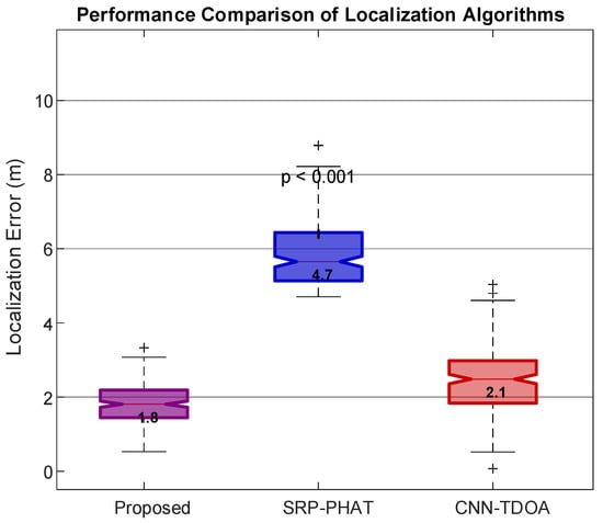 Figure 14, our method exhibits a median error of 1.8 m, which is significantly superior to other algorithms. The SRP-PHAT method demonstrates a right-skewed distribution with a median error of 3.9 m, while the CNN-TDOA method shows a bimodal distribution, reflecting the algorithm’s sensitivity to different scenarios. Moreover, our method maintains an error of 2.3 m at the 75th percentile, which is still lower than the median values of the other algorithms, thereby verifying the effectiveness of the dynamic weighting mechanism.