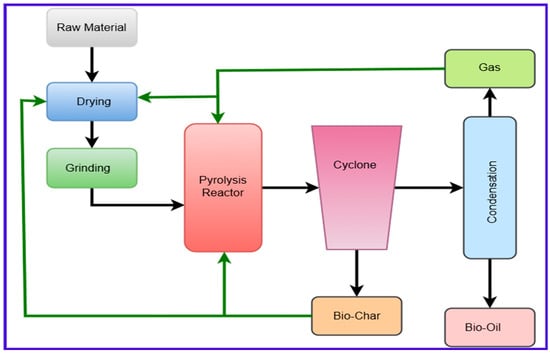 Biomass, obtained from organic substances, including agricultural wastes, forestry byproducts, and organic waste, has historically been a fundamental component of human energy consumption. The historical importance of this resource is derived from its ease of access, ability to be replenished, and wide range of uses, which span from traditional heating to the creation of biofuels []. In modern times, biomass is viewed as a renewable energy source that can provide carbon-neutral energy through pyrolysis [,]. Pyrolysis of biomass refers to the heat degradation of biopolymers present in organic matter under inertness and the absence of oxygen []. Pyrolysis is a very efficient technique for extracting energy from various forms of biomass, such as agricultural and forest wastes, organic waste, and municipal garbage []. Pyrolysis is the thermochemical conversion of biomass to gas, solid (char), and liquid (bio-oil) at 450 °C. It occurs without an oxidant or air at a moderate temperature. The reactor’s temperature, heating rate, and residence duration significantly impact the product produced during pyrolysis [,].