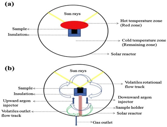 The solar reactor features three principal design aspects, which include (1) distinct temperature regions (Figure 4a), (2) fluid dynamics rotation (Figure 4b), and (3) changing pressure from argon gas flow. A graphite crucible contains a wood pellet while black graphite foam encases it for protection, as displayed in Figure 4a. The direct solar radiation increases the system’s temperature. Solar radiation passes through the argon gas base because this gas remains transparent in this light wavelength spectrum. This device’s heating method is achieved through direct contact with the sample surface and mixing with resulting volatile products from pyrolysis. Insulating graphite foam surrounds all sides and the bottom of the sample, creating a hot thermal area near the sample’s surface [,]. Most solar reactors exist in a lower temperature range than the heated crucible section. The high-temperature zone represents the only area where the secondary tar reactions can occur within particle surroundings. A circular tube houses six upward holes near the gas outlet and six downward holes on the opposite wall, enhancing mixing through this system. A simplified version shows the counter-current argon injector system through Figure 4b. Research has proven that the unconventional arrangement of the counter-current argon injector system creates rotational flow dynamics in the solar reactor that both experimental measurements and theoretical computations validate [].